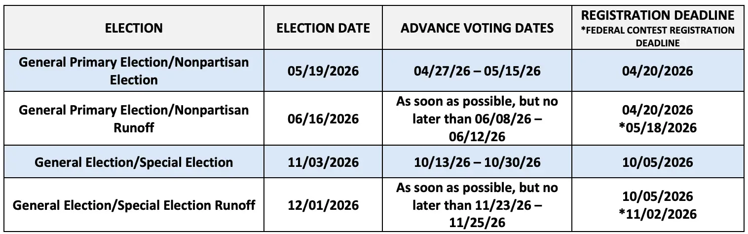 Be informed! The upcoming election dates along with voter registration deadlines are below. If you want a comprehensive calendar of upcoming election events, click here for a comprehensive schedule.
